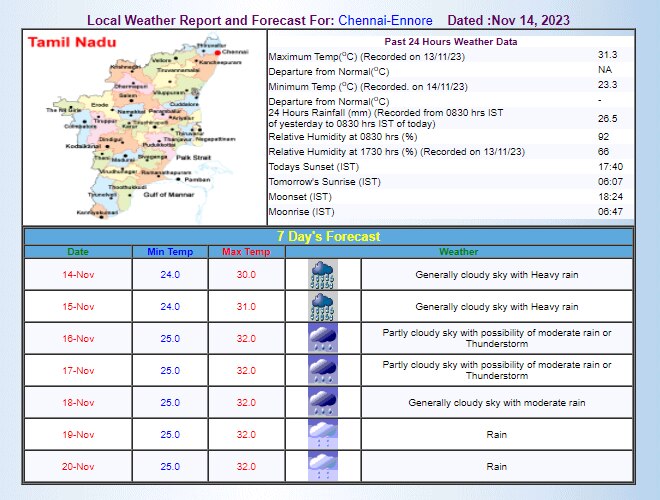 बारिश के कारण विल्लुपुरम, अरियालुर, कुड्डालोर, नागापट्टिनम, पुडुचेरी और कराईकल में स्कूलों और कॉलेजों में छुट्टी घोषित कर दी गई. मौसम विभाग के मुताबिक, 14 और 15 नवंबर को आमतौर पर आसमान में बादल छाए रहेंगे और भारी बारिश होगी. इसके भी बारिश का सिलसिला जारी रहेगा. हालांकि, बारिश की तीव्रता में कुछ कमी आ जाएगी. 16 से 18 नवंबर को आंशिक रूप से बादल छाए रहेंगे और मध्यम बारिश या गरज के साथ बौछारें पड़ने की संभावना है. इसके बाद बारिश की गति धीमी हो जाएगा.