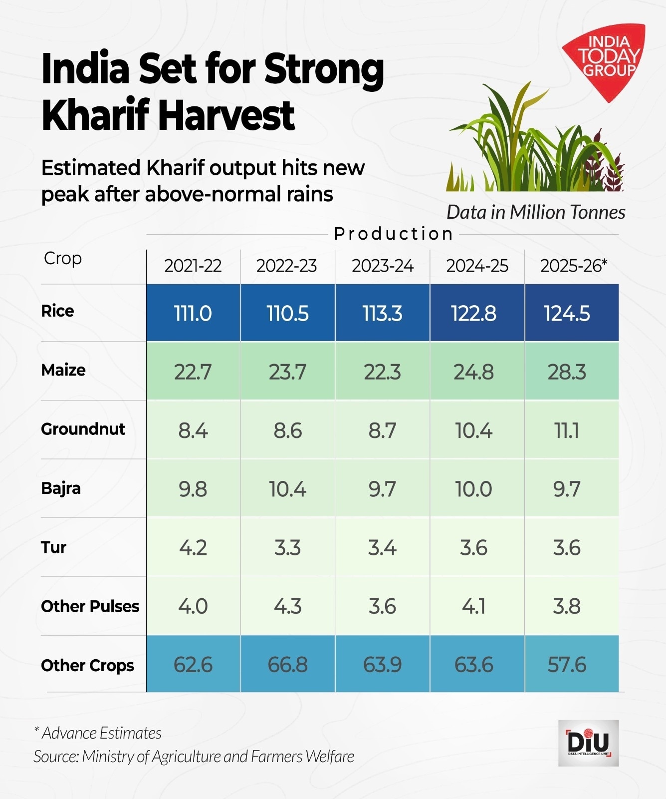 रागी, ज्वार, बाजरा, चावल, मक्का और अन्य छोटे मोटे अनाजों का उत्पादन 165.9 मिलियन टन होने का अनुमान है, जिसमें चावल और मक्का का योगदान मुख्य रूप से है. चावल का उत्पादन लगभग 124.5 मिलियन टन और मक्का का उत्पादन 28.3 मिलियन टन रहा, और दोनों फसलों का उत्पादन पिछले कई वर्षों में अपने उच्चतम स्तर पर पहुंच गया.