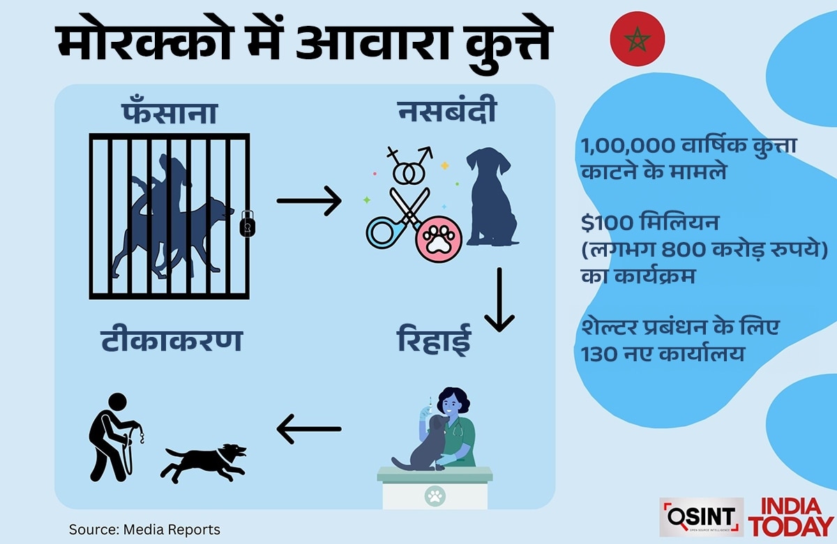 मोरक्को में हर साल करीब 1 लाख लोग कुत्तों के काटने का शिकार होते हैं. 2019 में सरकार ने Trap-Neuter-Vaccinate-Release (TNVR) प्रोग्राम शुरू किया. इसमें आवारा कुत्तों को पकड़कर नसबंदी और रेबीज का टीका लगाया जाता है, फिर उन्हें आईडी टैग के साथ उसी इलाके में छोड़ दिया जाता है ताकि लोग जान सकें कि वे सुरक्षित हैं.