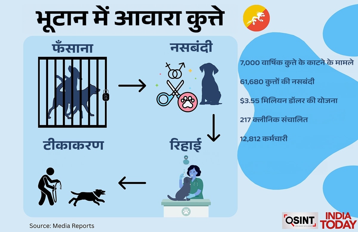भूटान ने Nationwide Accelerated Dog Population Management and Rabies Control Programme (NADPM & RCP) के तहत 100% फ्री-रोमिंग डॉग पॉपुलेशन की नसबंदी कर दी. World Organisation for Animal Health के श्रोत से मिली जानकारीा के अनुसार ये उपलब्धि हासिल करने वाला दुनिया का पहला देश बन गया. मार्च 2022 में शुरू हुआ यह प्रोजेक्ट अक्टूबर 2023 में पूरा हुआ, जिसकी लागत $3.55 मिलियन रही. तीन चरणों में चले इस अभियान में 12,812 लोग शामिल थे, जिनमें वेटरिनेरियन भी थे. 217 क्लीनिक से ऑपरेशन करते हुए कुल 61,680 कुत्तों की नसबंदी की गई, जिनमें से 91% आवारा थे.