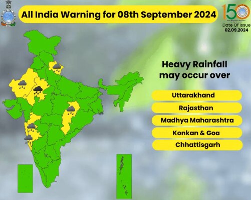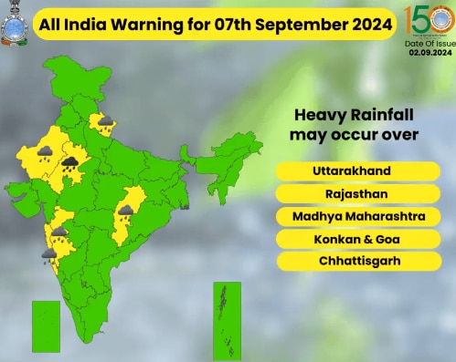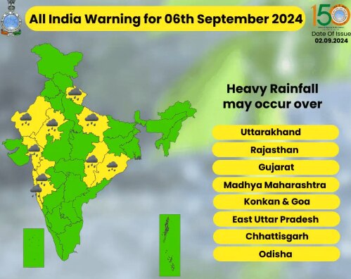 अगले दिन 6 सितंबर को उत्तराखंड, राजस्थान, गुजरात, मध्य माहाराष्ट्र, कोंकण व गोवा, पश्चिमी उत्तर प्रदेश, छत्तीसगढ़ और ओडिशा में बारिश का येलो अलर्ट है.