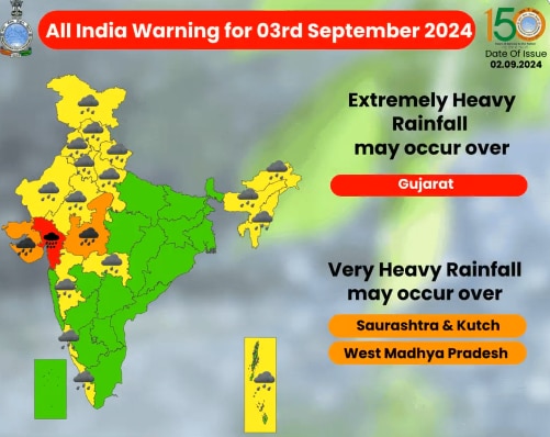 आईएमडी के मुताबिक, आज यानी 3 सितंबर को गुजरात में भयंकर बारिश हो सकती है. यहां के लिए मौसम विभाग के रेड अलर्ट जारी किया है. इसके अलावा सौराष्ट्र, कच्छ और पश्चिमी मध्य प्रदेश के लिए ऑरेंज अलर्ट जारी किया गया है. यहां बहुत भारी बारिश का अलर्ट है. इसके अलावा कई राज्यों में बारिश का येलो अलर्ट है.