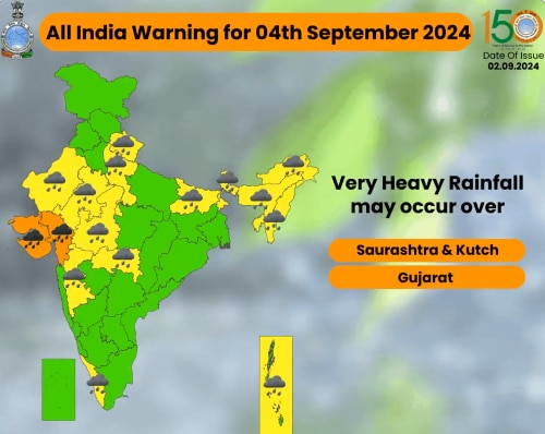 कल यानी 4 सितंबर को बारिश की तादाद में कुछ कमी होने की उम्मीद है. केवल सौराष्ट्र, कच्छ और गुजरात में बहुत भारी बारिश के साथ आईएमडी ने ऑरेंज अलर्ट जारी किया है. हालांकि कई राज्यों के लिए येलो अलर्ट जारी है.
