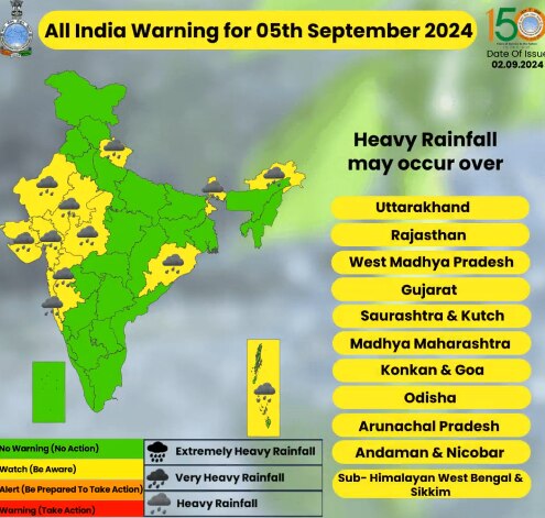 हर दिन के साथ बारिश की तादाद में कमी देखी जा रही है. 5 सिंतबर को उत्तराखंड, राजस्थान, पश्चिमी मध्य प्रदेश, गुजरात, सौराष्ट्र, कच्छ, मध्य महाराष्ट्र, कोकण, गोवा, ओडिशा, अरुणांचल प्रदेश, अंडमान निकोबार और उप हिमालयी पश्चिम बंगाल व सिक्किम में भारी बारिश के साथ येलो अलर्ट जारी किया गया है.