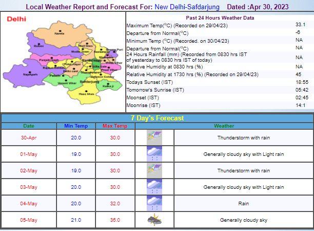 दिल्ली में 4 मई तक बारिश व आंधी की गतिविधियां देखने को मिलेंगी. वहीं, 4 मई के बाद मौसम में एक बार फिर गर्मी और तापमान में बढ़ोतरी देखने को मिल सकती है. 5 मई को दिल्ली का अधिकतम तापमान 35 डिग्री और न्यूनतम तापमान 21 डिग्री सेल्सियस के आस-पास रह सकता है.