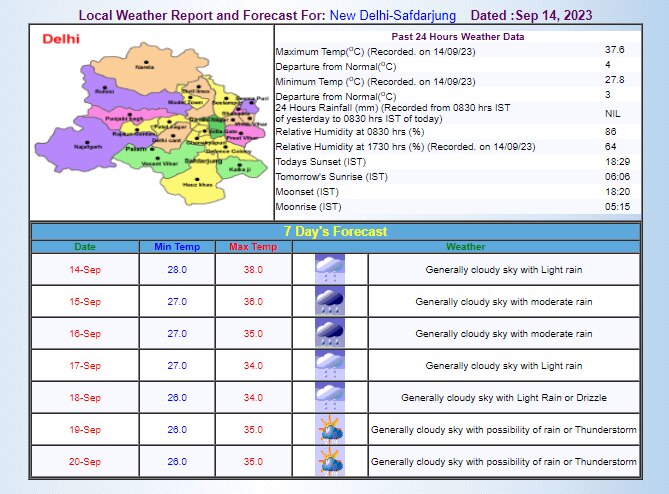 मौसम विभाग की मानें तो नई दिल्ली में आज यानी शुक्रवार को न्यूनतम तापमान 27 डिग्री और अधिकतम तापमान 36 डिग्री दर्ज किया जा सकता है. वहीं, आज आसमान में बादलों का डेरा रहेगा. इसी के साथ, मध्यम तीव्रता की बारिश भी देखने को मिल सकती है. शनिवार को भी नई दिल्ली में मध्यम तीव्रता की बारिश हो सकती है.