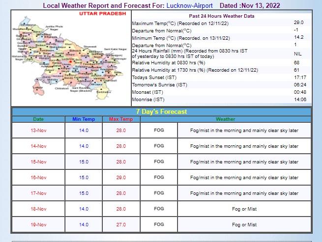 उत्तर प्रदेश की राजधानी लखनऊ में न्यूनतम तापमान 14 डिग्री और अधिकतम तापमान 28 डिग्री रहेगा. इसके अलावा सुबह के वक्त कोहरा रहेगा और बाकी दिन के वक्त आसमान साफ रहेगा. प्रदूषण की बात की जाए तो SAFAR के मुताबिक, नोएडा में कल एक्यूआई 346 रहने की संभावना है.