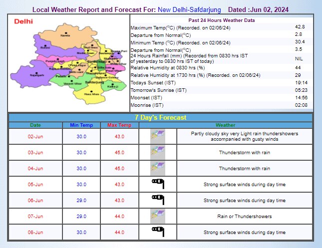 दक्षिणी दिल्ली के आया नगर में तापमान 43.4 डिग्री सेल्सियस, रिज में 43.7 डिग्री सेल्सियस और पालम में 43.5 डिग्री सेल्सियस दर्ज किया गया. मौसम विभाग ने आज यानी 3 जून को दिल्ली में बारिश के साथ आंधी की संभावना जताई है. इसके साथ ही तापमान में कुछ बढ़त के आसार हैं.