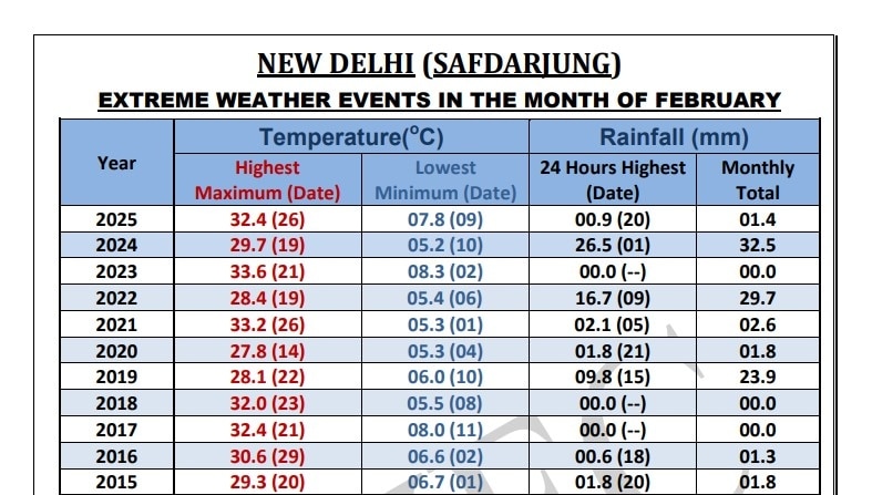 Delhi February Temperature Record