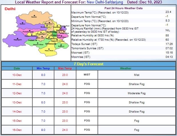 दिल्ली की बात करें तो यहां आज, 11 दिसंबर को दिनभर मौसम साफ रहने की संभावना है. हालांकि, सुबह के वक्त हल्का कोहरा देखने को मिला है. तापमान की बात करें तो न्यूनतम तापमान 07 डिग्री सेल्सियस और अधिकतम तापमान 23 डिग्री सेल्सियस दर्ज किया जा सकता है. वहीं, पूरे सप्ताह दिल्ली में कोहरा रहने का पूर्वानुमान है.