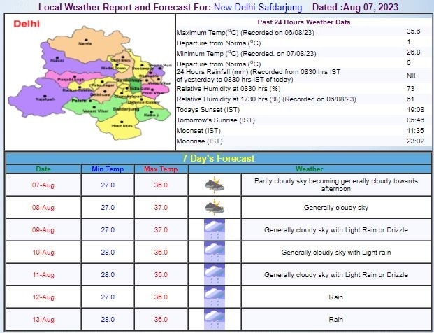 मौसम विभाग के पूर्वानुमान के अनुसार, इस पूरे हफ्ते दिल्ली में बारिश की गतिविधि काफी कम रहेगी. IMD के अनुसार, 7 अगस्त को दोपहर ढलने के बाद बादल छाए रहेंगे लेकिन बारिश की संभावना नहीं है. दिल्ली में अधिकतम तापमान 37 और न्यूनतम तापमान 27 डिग्री सेल्सियस तक रह सकता है. दिल्ली में 7 और 8 अगस्त को मौसम पूरी तरह शुष्क बना रहेगा जबकि 9 अगस्त से बारिश को हल्की बूंदाबांदी देखने को मिल सकती है. 13 अगस्त तक दिल्ली में बारिश हल्की हो सकती है.