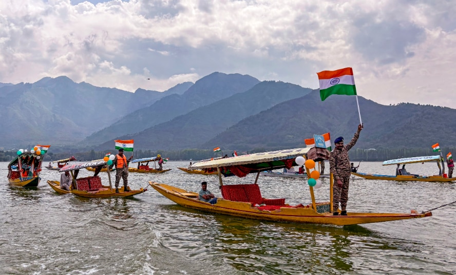 सीआरपीएफ के जवानों ने 79वें स्वतंत्रता दिवस के मौके पर श्रीनगर में डल झील में 'तिरंगा बोट रैली' में भाग लिया.