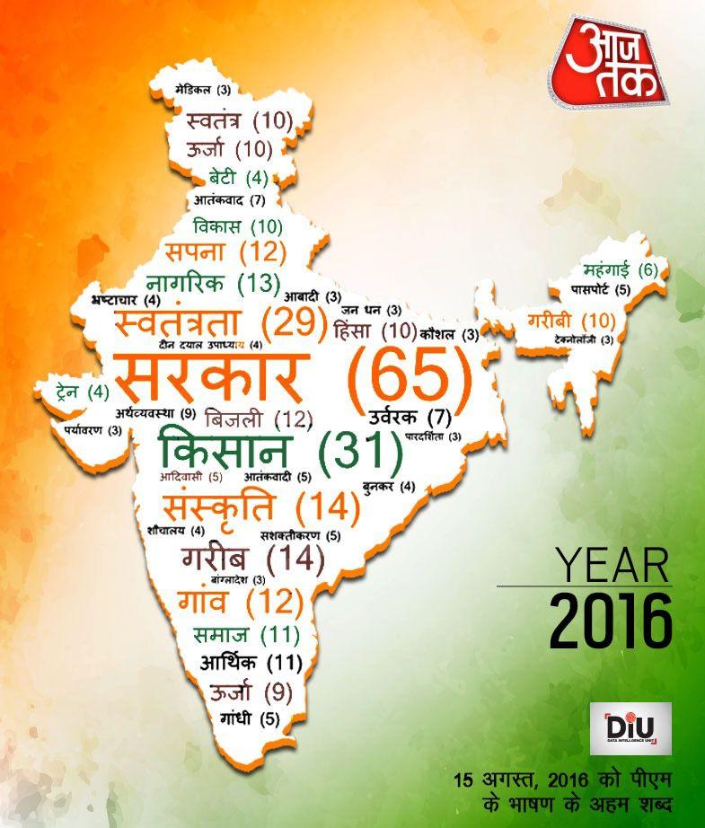 2016: इस बार भी पीएम ने सबसे ज्यादा 65 बार 'सरकार' शब्द ही कहा था. वहीं, 31 बार 'किसान', 29 बार 'स्वतंत्रता', 14-14 बार 'गरीब' और 'संस्कृति' शब्द का इस्तेमाल किया था. इनके अलावा 12-12 बार 'गांव', 'सपना' और 'बिजली', 11-11 बार 'आर्थिक' और 'समाज', 10-10 बार 'गरीबी' और 'विकास' शब्द का जिक्र किया था.