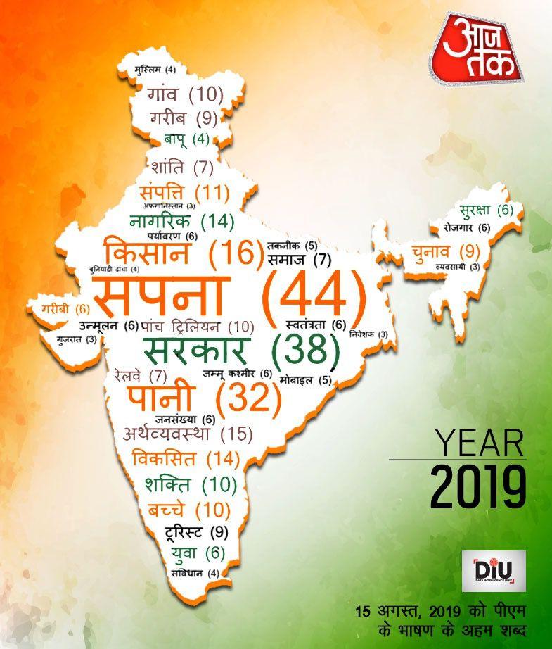 2019: इस भाषण में मोदी ने 44 बार 'सपना' और 38 बार 'सरकार' शब्द का इस्तेमाल किया था. उसके बाद 32 बार 'पानी' शब्द कहा था. इनके अलावा 16 बार 'किसान', 15 बार 'अर्थव्यवस्था', 14-14 बार 'नागरिक' और 'विकसित', 10-10 बार 'गांव', 'शक्ति' और 'बच्चे' शब्द का इस्तेमाल किया था. 10 बार '5 ट्रिलियन' शब्द का भी जिक्र किया था.