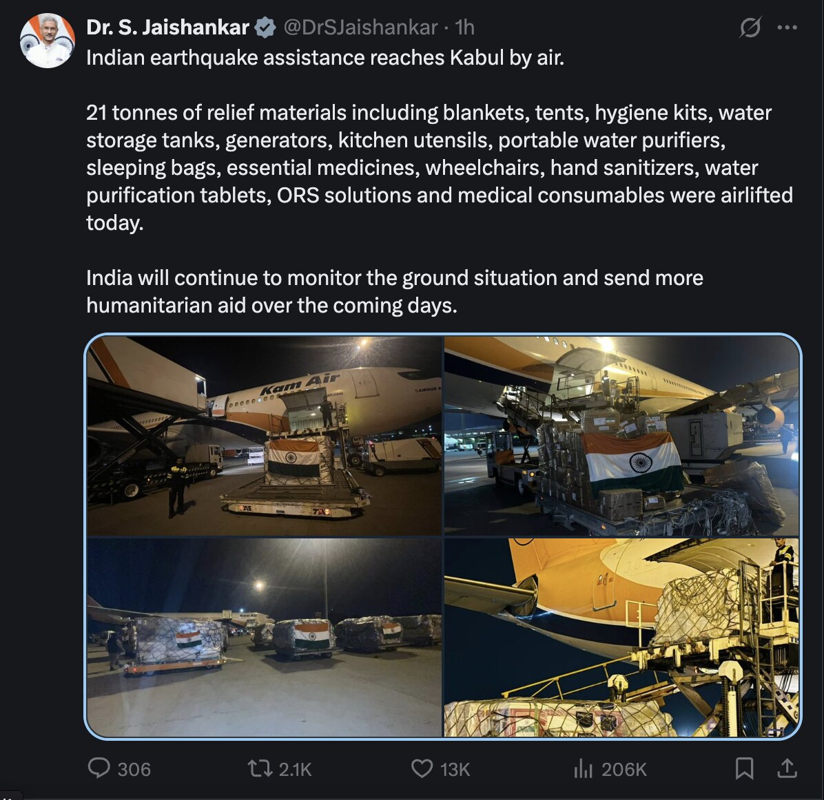 सोशल मीडिया प्लेटफॉर्म एक्स पर पोस्ट करते हुए विदेश मंत्री जयशंकर ने लिखा, 'भारत की भूकंप पीड़ितों के लिए भेजी गई राहत सामग्री काबुल हवाई माध्यम से पहुंच गई है. जिसमें कंबल, टेंट, स्वच्छता किट, जल भंडारण टैंक, जनरेटर, रसोई के बर्तन, पोर्टेबल वाटर प्यूरीफायर, स्लीपिंग बैग, आवश्यक दवाएं, व्हीलचेयर, हैंड सैनिटाइज़र, जल शोधन गोलियां, ओआरएस घोल और चिकित्सा उपभोग्य वस्तुएं शामिल हैं.'