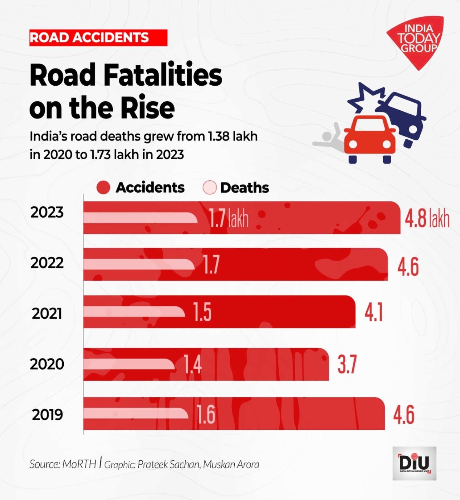 पिछले पांच सालों के सड़क दुर्घटनाओं का डेटा परेशान करने वाले हैं. 2019 में भारत में 4.56 लाख दुर्घटनाएं दर्ज की गईं, जिनमें लगभग 1.59 लाख मौतें हुईं. महामारी काल वर्ष 2020 में सख्त लॉकडाउन के कारण 3.7 लाख दुर्घटनाएं हुईं. लेकिन उसके बाद 2021 में भारत में लगभग 4.2 लाख सड़क दुर्घटनाएं हुईं, जो 2022 में बढ़कर 4.61 लाख और 2023 में 4.80 लाख हो गईं. कुल मिलाकर केवल पांच सालों में 21 लाख से ज़्यादा दुर्घटनाएं हुईं हैं और लगभग 8 लाख मौतें हुईं हैं. सबसे चौंकाने वाली बात ये है कि हर तीन में से एक हादसा जानलेवा साबित हुआ है.