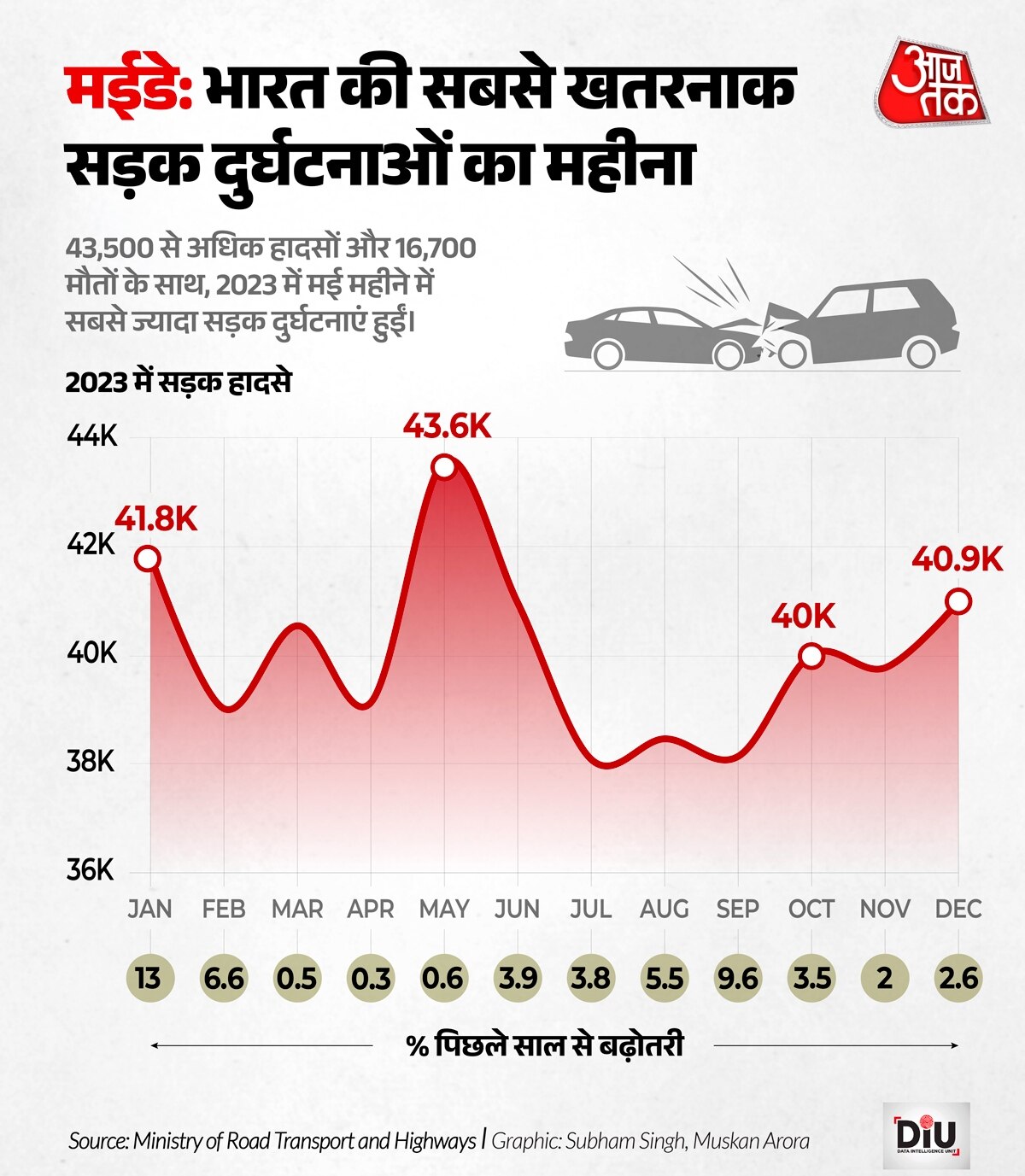 डेटा बताता है कि मई 2023 सबसे जानलेवा महीना था, जब 43,500 से ज्यादा दुर्घटनाएं हुईं. जनवरी (41,841) और दिसंबर (40,997) में भी हादसों की संख्या ज्यादा रही. इसका मतलब है कि गर्मी और साल के अंत में सड़क पर जोखिम बढ़ जाता है. 2022 के आंकड़े भी इसी पैटर्न को दिखाते हैं, जिसमें मई 43,300 हादसों के साथ सबसे खतरनाक महीना था, इसके बाद मार्च (40,356) और दिसंबर (39,954) थे.