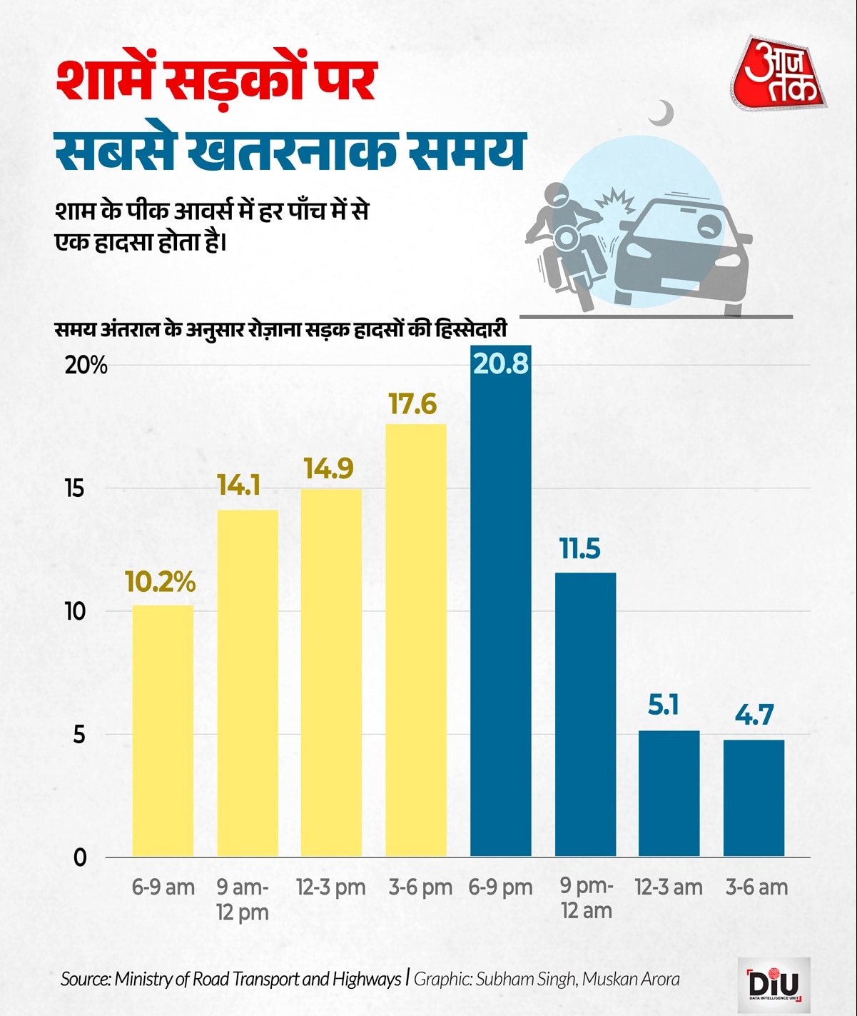रिपोर्ट के अनुसार शाम 6 से 9 बजे के बीच सबसे ज्यादा हादसे होते हैं. इस तीन घंटे के समय में लगभग 21 प्रतिशत दुर्घटनाएं होती हैं.