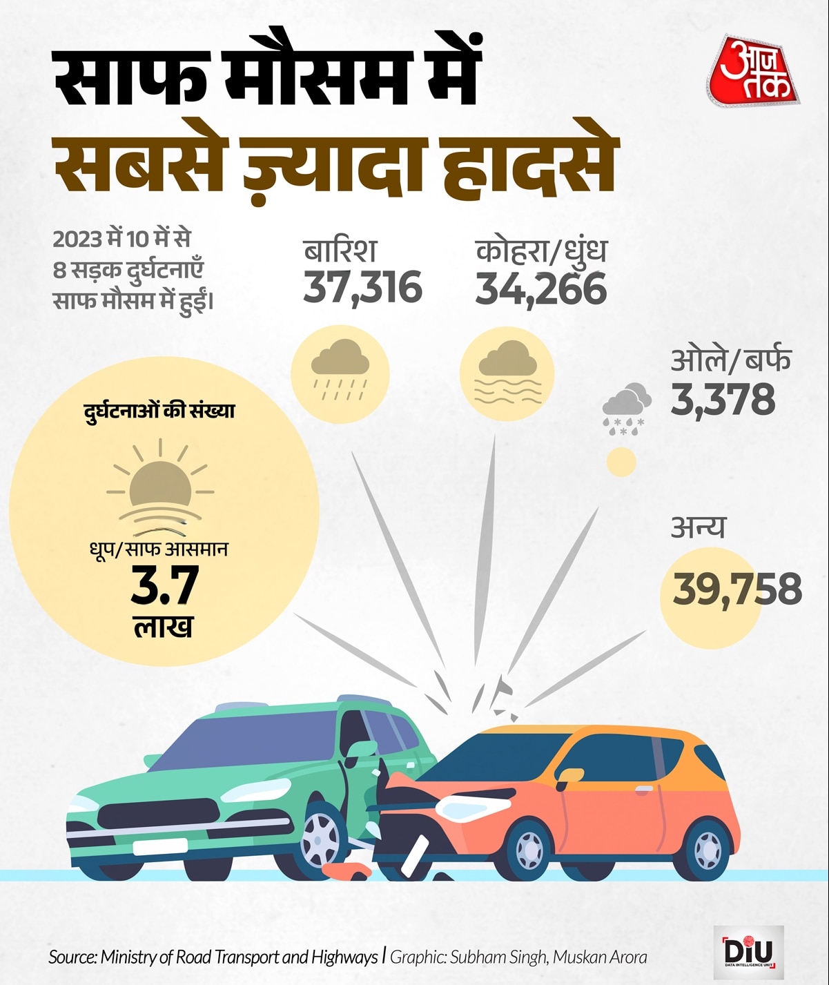 अक्सर माना जाता है कि बारिश या कोहरा सबसे ज्यादा हादसों का कारण होते हैं. लेकिन रिपोर्ट के आंकड़े इसे चुनौती देते हैं. 2023 में 76 प्रतिशत से ज्यादा दुर्घटनाएं साफ और धूप वाले मौसम में हुईं. बारिश में 7.8 प्रतिशत और कोहरे या धुंध वाले मौसम में 7.1 प्रतिशत हादसे हुए.