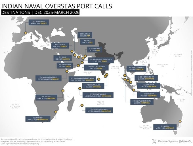 रिपोर्ट में बताया गया है कि दिसंबर 2025 और मार्च 2026 के बीच भारतीय जहाजों ने खाड़ी और लाल सागर क्षेत्र में कई महत्वपूर्ण दौरे किए. आईएनएस सुदर्शन ने मार्च 2026 में फ्रांस और फरवरी 2026 में ओमान का दौरा किया.