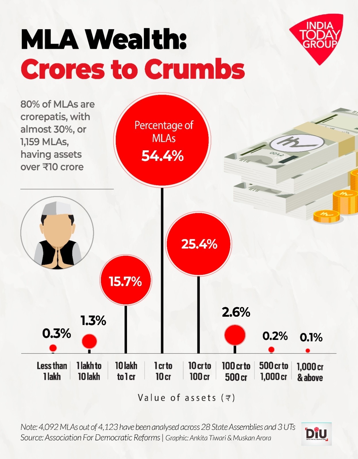 पैसा और राजनीति का रिश्ता हमेशा से गहरा रहा है. एसोसिएशन फॉर डेमोक्रेटिक रिफॉर्म्स (ADR) की नई रिपोर्ट बताती है कि देश के विधायकों की संपत्ति में जबरदस्त अंतर है. 28 राज्यों और 3 केंद्र शासित प्रदेशों के 4,092 विधायकों के वित्तीय हलफनामों के मुताबिक, कुछ विधायक सैकड़ों करोड़ की संपत्ति के मालिक हैं, तो कुछ के पास सिर्फ लाखों में संपत्ति है.