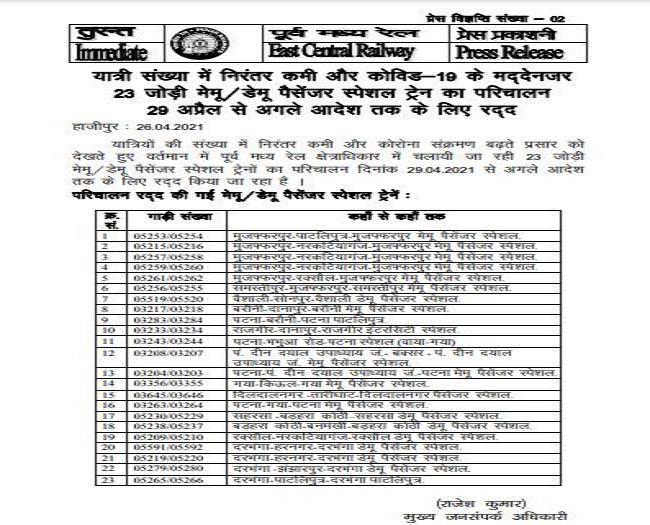 पूर्व मध्य रेलवे के मुख्य जन संपर्क अधिकारी राजेश कुमार ने बताया कि यात्रियों की कमी के चलते कई ट्रेनों को रद्द किया जा रहा है. साथ ही उन्होंने रद्द की गई ट्रेनों की सूची भी जारी की है.
