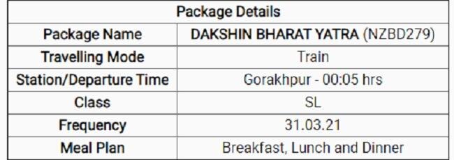 इस टूर पैकेज की मदद से आप दक्षिणी भारत के कुछ सबसे खूबसूरत स्थलों की सैर कर सकेंगे. इसमें मल्लिकार्जुन, कन्याकुमारी, रामेश्वरम, मदुरै, त्रिवेंद्रम और तिरुपति शामिल हैं. इसके लिए यात्री गोरखपुर, देवरिया सदर, बेल्थारा रोड, मऊ, वाराणसी, जौनपुर सिटी, सुल्तानपुर, लखनऊ, कानपुर और झांसी से ट्रेन में चढ़ सकते हैं.