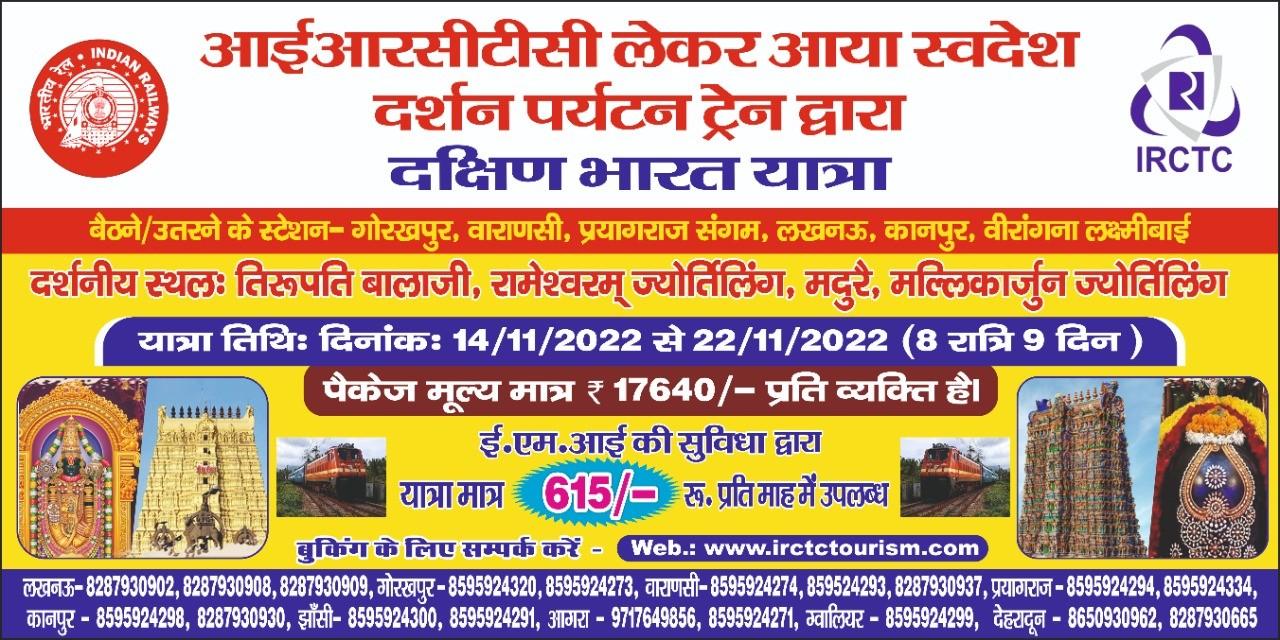 इसके पैकेज के अर्न्तगत रामेश्वरम मदुरई मल्लिकार्जुन और तिरुपति बालाजी के दर्शन कराए जाएंगे. इस ट्रेन में बैठने की सुविधा गोरखपुर, वाराणसी, प्रयागराज संगम, लखनऊ, कानपुर और वीरांगना लक्ष्मीबाई से उपलब्ध है.