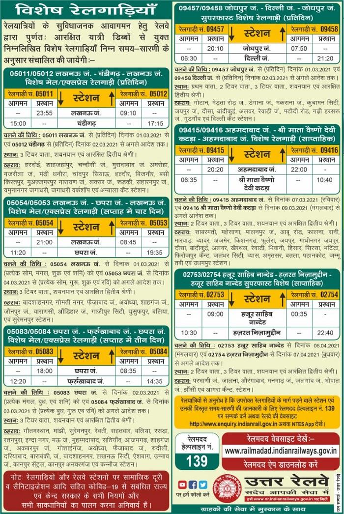 गाड़ी संख्या 05012- चंडीगढ़-लखनऊ मेल/एक्सप्रेस ट्रेन (प्रतिदिन) का परिचालन 02 मार्च 2021 से शुरू होगा. इसमें थर्ड एसी, स्लीपर और सेकेंड क्लास में टिकटों की बुकिंग करवा सकते हैं.
