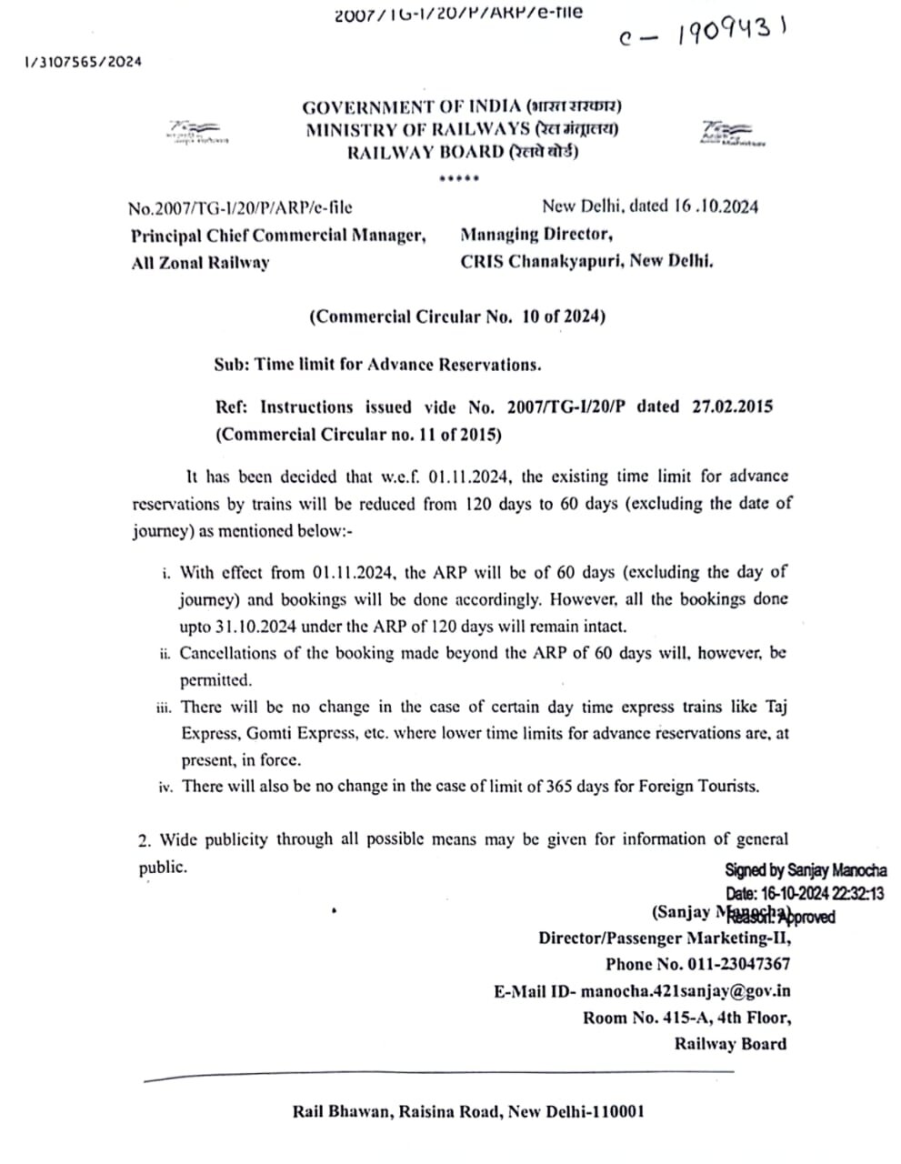 बता दें कि भारतीय रेलवे यात्रियों को चार महीने पहले टिकट बुक करने की सुविधा प्रदान करती थी, लेकिन इस सुविधा में रेलवे ने बदलाव करने का निर्णय लिया है. रेलवे बोर्ड ने 16 अक्टूबर को एक पत्र जारी कर आरक्षण नियम में बदलाव की जानकारी दी है, जिसमें रेलवे के सभी जोन के प्रिंसिपल चीफ कमर्शियल मैनेजर को निर्देशित किया है कि 120 दिन पहले आरक्षित टिकट बुक करने की व्यवस्था में बदलाव किया जा रहा है.