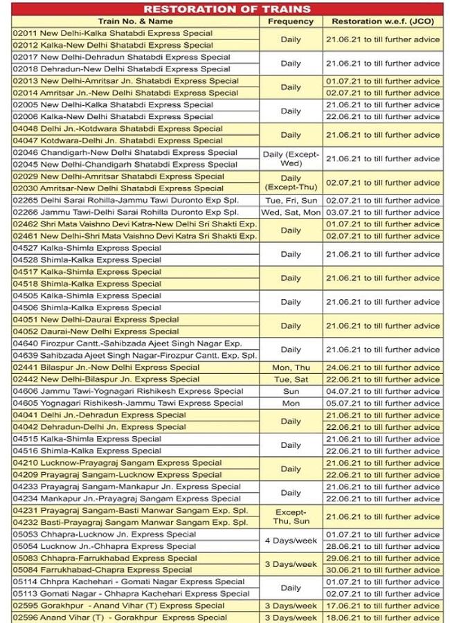ट्रेन संख्या 02462 श्रीमाता वैष्णो देवी कटड़ा-नई दिल्ली श्री शक्ति एक्सप्रेस स्पेशल ट्रेन 01 जुलाई से यात्रियों को सुविधा देगी. वहीं, गाड़ी संख्या 02461 नई दिल्ली-श्रीमाता वैष्णो देवी कटड़ा श्री शक्ति एक्सप्रेस स्पेशल ट्रेन 2 जुलाई 2021 से शुरु की जा रही हैं. इसके अलावा 02011 नई दिल्ली-कालका शताब्दी एक्सप्रेस स्पेशल 02012 कालका-नई दिल्ली शताब्दी एक्सप्रेस स्पेशल, 02017 नई दिल्ली-देहरादून शताब्दी एक्सप्रेस स्पेशल, 02018 देहरादून-नई दिल्ली शताब्दी एक्सप्रेस स्पेशल, 04527 कालका-शिमला शिवालिक डिलक्स स्पेशल ट्रेन, 04528 शिमला-कालका शिवालिक डिलक्स स्पेशल 21 जून से यात्रियों को सर्विस देंगी.