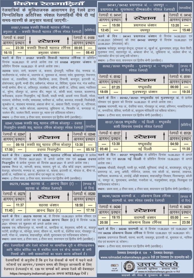 उत्तर पश्चिम रेलवे करीब 10 ट्रेन सेवाएं बिहार और यूपी के बीच संचालित की जाएगी. यहां देखें लिस्ट.गोरखपुर से पनवेल के लिए गाड़ी संख्या 05063 प्रत्येक रविवार, गुरुवार संचालित होगी. इसी तरह पनवेल से गोरखपुर गाड़ी संख्या 05064 प्रत्येक सोमवार, शुक्रवार अपनी सेवा देगी. छत्रपति शिवाजी महाराज टर्मिनस से अमृतसर और अमृतसर-छत्रपति शिवाजी महाराज के बीच 19 जून से अगले आदेश तक चलेगी. वहीं, प्रयागराज से उघमपुर और अघमपुर से प्रयागराज के बीच 14 जून से प्रत्येक सोमवार और मंगलवार ट्रेन चलाई जाएगी.
