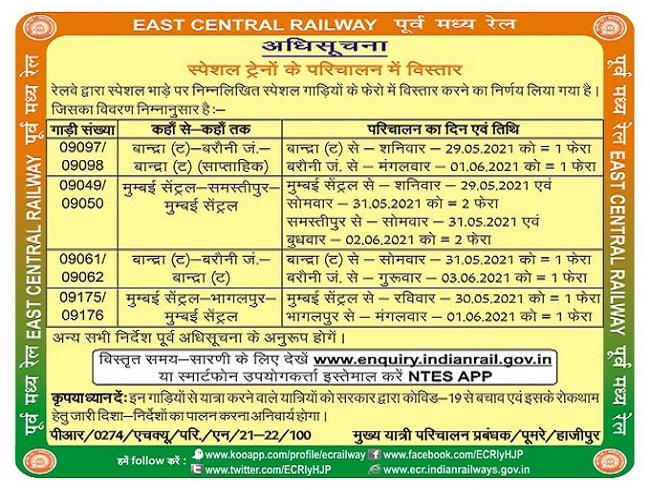 इसके अलावा पूर्वी रेलवे ने यात्रियों की सुविधा के लिए बांद्रा टर्मिनस से बरौनी और मुंबई सेंट्रल से समस्तीपुर और भागलपुर के बीच चलायी जा रही 04 जोड़ी स्पेशल ट्रेनों के परिचालन अवधि में वृद्धि की है. साथ ही रेलवे ने यात्रियों से अनुरोध किया है वह यात्रा के दौरान कोविड प्रोटोकॉल का पालन जरुर करें.