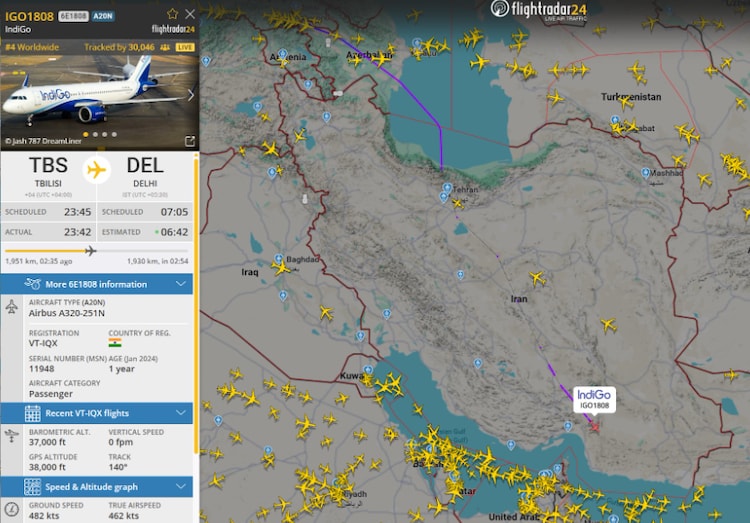 लाइव फ्लाइट ट्रैकिंग साइट Flightradar24 के मुताबिक, इंडिगो की फ्लाइट 6E1808 बुधवार को सुबह 11.29 बजे त्बिलिसी से रवाना हुई और गुरुवार सुबह 7.03 बजे दिल्ली में उतरी. विमान रात करीब 2.35 बजे ईरानी एयरस्पेस से गुज़रा.