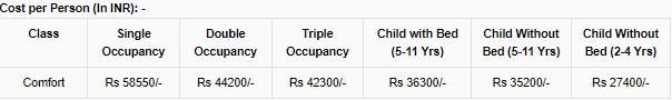 अगर आप अकेले के लिए इस टूर पैकेज की बुकिंग कर रहे हैं तो आपको 58,550 रुपये खर्च करने होंगे. वहीं, अगर आपको दो लोगों के लिए बुकिंग करानी है तो प्रति व्यक्ति आपको 44200 रुपये खर्च करने होंगे. तीन लोगों के लिए प्रति व्यक्ति 42300 रुपये खर्च करने होंगे. वहीं, बच्चों के लिए अलग से किराया भरना होगा.