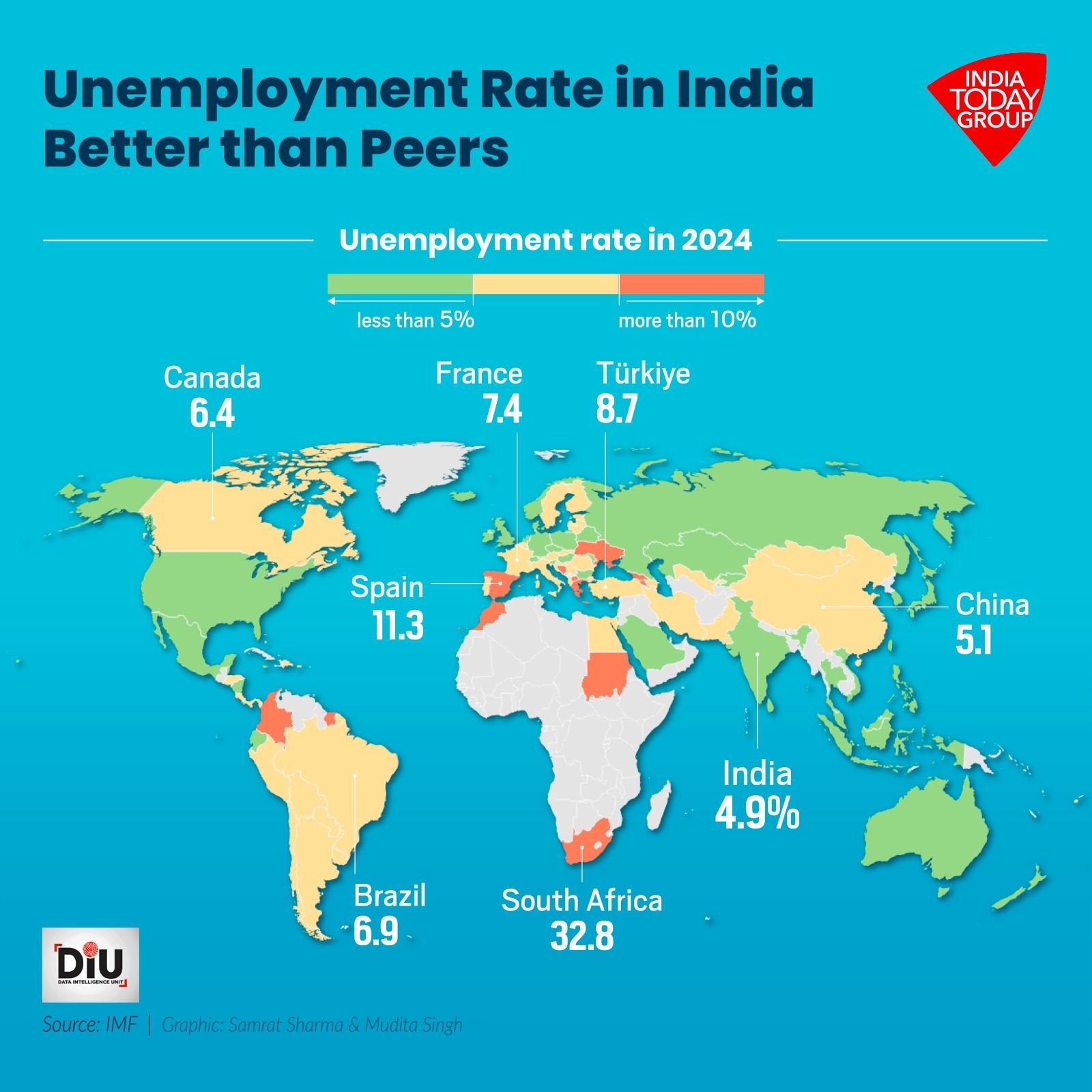 बेहतर होती रोजगार स्थिति के साथ भारत अपने कई समकक्ष देशों से आगे है. भारत की बेरोजगारी दर 4.9% के मुकाबले, दक्षिण अफ्रीका में 32.8%, स्पेन में 11.4%, तुर्की में 8.7%, फ्रांस में 7.4%, ब्राजील में 6.9%, कनाडा में 6.4%, और चीन में 5.1% है.