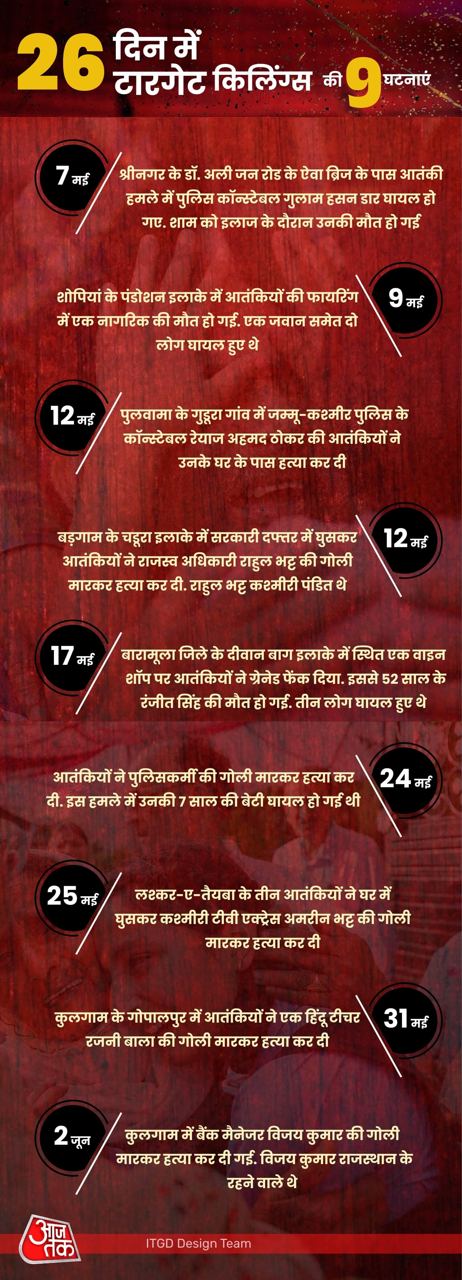 कश्मीर में पिछले साल 8 जून को सरपंच अजय पंडित की हत्या से टारगेट किलिंग का सिलसिला शुरू हुआ था. इसके बाद 5 अक्टूबर को श्रीनगर के केमिस्ट एमएल बिंद्रू की हत्या कर दहशत फैला दी गई. दो दिन के बाद ही यानी 7 अक्टूबर को आतंकियों ने एक स्कूल की प्रिंसिपल सतिंदर कौर और टीचर दीपक चंद की हत्या कर दी. मई में टारगेट किलिंग की 8 घटनाएं सामने आईं. रजनी बाला की हत्या से पहले 12 मई को आतंकियों ने बड़गाम में दफ्तर में घुसकर राजस्व अधिकारी राहुल भट्ट की हत्या कर दी थी. जाहिर है इससे सरकारी कर्मचारी डरे-सहमे हुए हैं.