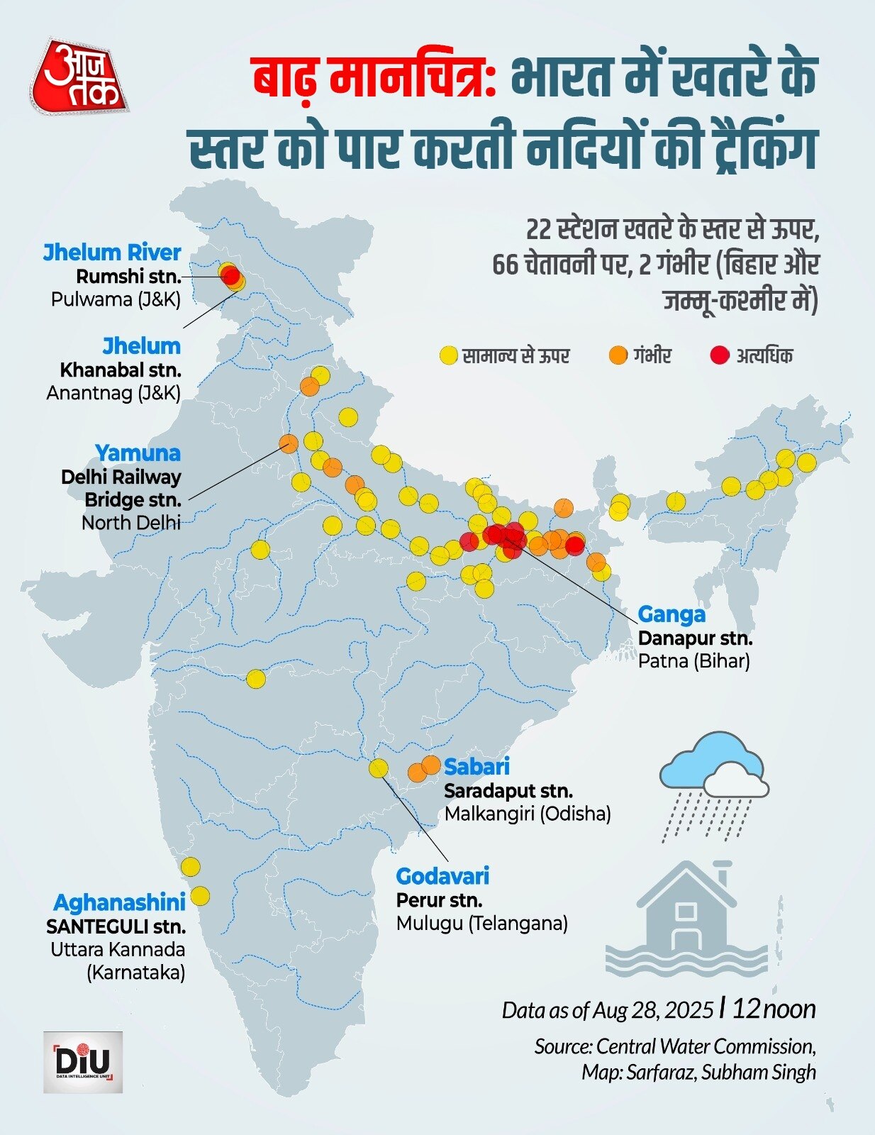 सेंट्रल वॉटर कमीशन (CWC) की फ्लड फोरकास्ट पोर्टल के मुताबिक, फिलहाल 22 वाटर मॉनिटरिंग स्टेशन खतरे के निशान से ऊपर बह रहे हैं, 66 चेतावनी स्तर पार कर चुके हैं और दो स्टेशन बिहार के पटना जिले का मसौढ़ी (धर्धा नदी) और जम्मू-कश्मीर के पुलवामा का रुशमी (झेलम नदी) अत्यधिक बाढ़ स्तर पर हैं. ज़्यादातर हाई फ्लड लेवल गंगा, यमुना और उनकी सहायक नदियों में दर्ज किए गए हैं.