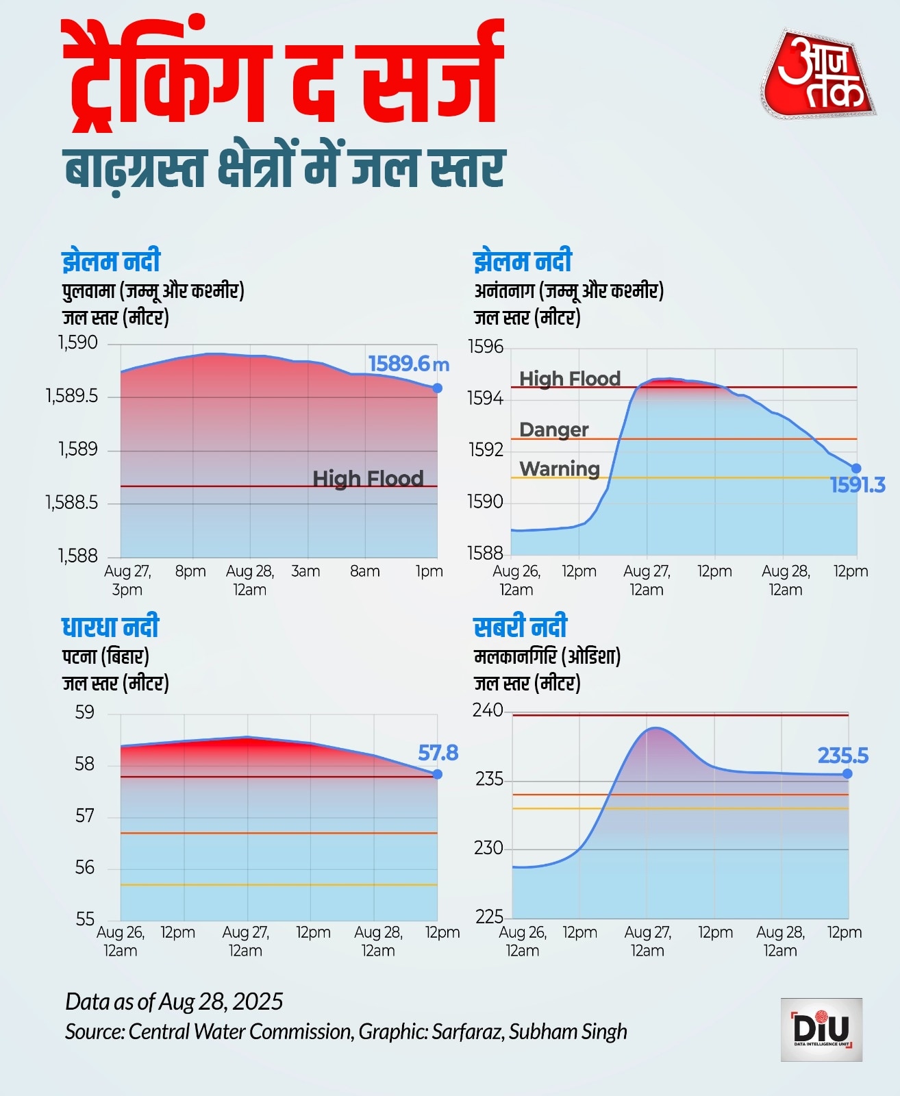 CWC के ऑवरली हाइड्रोग्राफ डेटा से पता चलता है कि नदी का जलस्तर अचानक बढ़ा है. जम्मू-कश्मीर के अनंतनाग में झेलम नदी 24 अगस्त शाम 4 बजे तक चेतावनी स्तर (1,591 मी.) से करीब 1 मीटर नीचे थी. लेकिन सिर्फ एक घंटे में ही पानी का स्तर 2 मीटर बढ़ा और 26 अगस्त तक हाई फ्लड लेवल (1,594.5 मी.) पर पहुंच गया. ऐसा ही ट्रेंड ओडिशा के सरदपुट स्टेशन (सबरी नदी) में देखने को मिला, जहां 12 घंटे में जलस्तर 8 मीटर ऊपर चला गया और खतरे के निशान को पार कर गया.