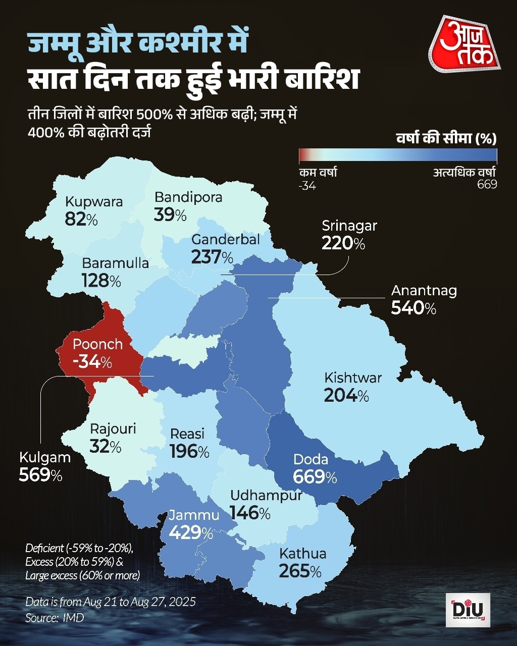 पिछले सात दिनों में जम्मू-कश्मीर में 260% ज्यादा बारिश हुई है. IMD के आंकड़े बताते हैं कि अनंतनाग, डोडा और कुलगाम सबसे ज्यादा प्रभावित रहे, जहां सामान्य से 500% से ज्यादा बारिश दर्ज हुई. पुलवामा, रामबन, सांबा और जम्मू में भी हालात इसी तरह रहे. वहीं, पूंछ जिले में बारिश कम हुई और यहां -34% की कमी दर्ज हुई.