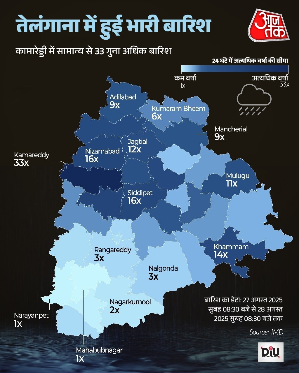 ये बारिश सिर्फ जम्मू-कश्मीर तक सीमित नहीं रही. तेलंगाना में भी हालात हैरान करने वाले रहे. कामारेड्डी जिले में सामान्य से 3,246% ज्यादा बारिश दर्ज हुई. निजामाबाद, मेडक, सिद्दिपेत, करीमनगर और निर्मल में भी बारिश 1,000% से ज्यादा रही.