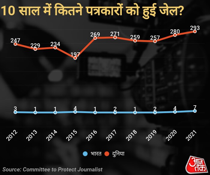 पत्रकारों की सुरक्षा पर काम करने वाली अमेरिकी संस्था 'कमेटी टू प्रोटेक्ट जर्नलिस्ट' यानी CPJ के आंकड़ों के मुताबिक, भारत में 2021 में 7 पत्रकारों को जेल में डाला गया, जबकि इससे पहले 2020 में 4 पत्रकारों को कैद किया गया था. CPJ के अनुसार, 2012 से 2021 तक 10 साल में 26 पत्रकारों को जेल में डाला गया है. इसी दौरान दुनियाभर में ढाई हजार से ज्यादा पत्रकारों को जेल में डाला गया.