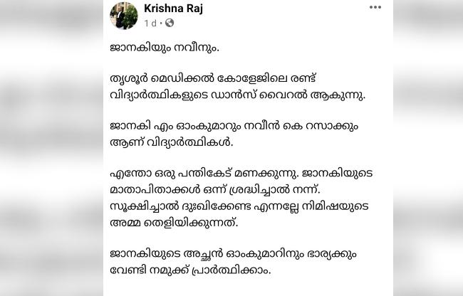 दरअसल, कुछ लोग इसे सांप्रदायिक रंग देने की कोशिश कर रहे हैं. एक फेसबुक यूजर कृष्णा राज ने फेसबुक पर लिखा, "थ्रिसूर मेडिकल कॉलेज के दो स्टूडेंट्स का डांस वीडियो वायरल रहा है. स्टूडेंट्स का नाम जानकी ओमकुमार और नवीन के रज्जाक है. मुझे तो यहां गड़बड़ लग रही है. जानकी के माता-पिता थोड़ा सतर्क हो जाएं, तो बेहतर होगा."