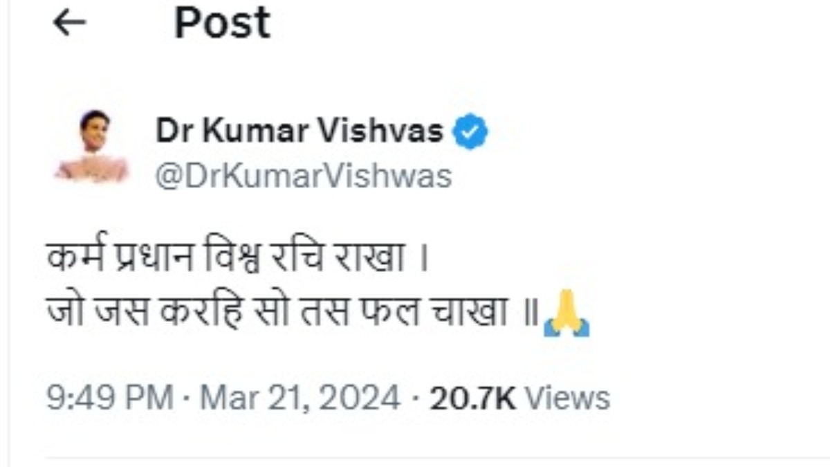 कुमार विश्वास ने सोशल मीडिया प्लेटफॉर्म एक्स पर केजरीवाल का नाम लिए बगैर पोस्ट किया और लिखा, 'कर्म प्रधान विश्व रचि राखा, जो जस करहि सो तस फल चाखा' दरअसल यह चौपाई रामचरित मानस की है जिसमें गोस्वामी तुलसीदास कर्म के महत्व पर जोर देते हुए वे कहते हैं यह संसार, यह विश्व कर्म प्रधान है. जो व्यक्ति जैसा करता है उसे वैसे ही फल की प्राप्ति होती है.'