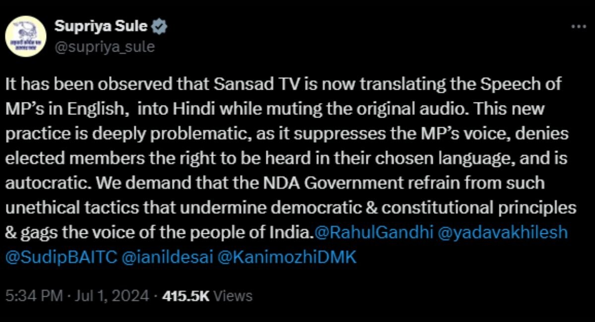 सुप्रिया सुले ने एक एक्स पोस्ट में कहा, "संसद टीवी ने इस लोकसभा के पहले सत्र में सांसदों द्वारा अंग्रेजी या क्षेत्रीय भाषाओं में दिए गए भाषणों को हिंदी में वॉयसओवर देने की "खतरनाक" प्रथा शुरू की है, और बजट सत्र में भी ऐसा किया जा रहा है."