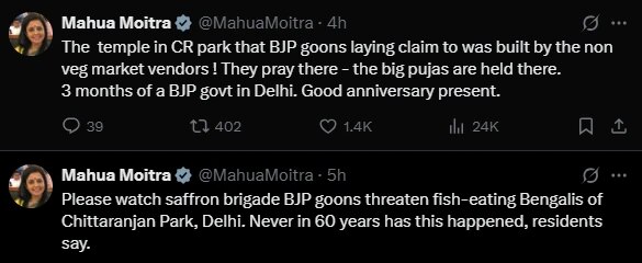 मोइत्रा ने कहा, 'सीआर पार्क में जिस मंदिर पर भाजपा के गुंडे दावा कर रहे हैं, उसे मांसाहारी विक्रेताओं ने बनवाया था! वे वहां प्रार्थना करते हैं- वहां बड़ी पूजाएं होती हैं. दिल्ली में भाजपा सरकार के तीन महीने हो गए हैं.'