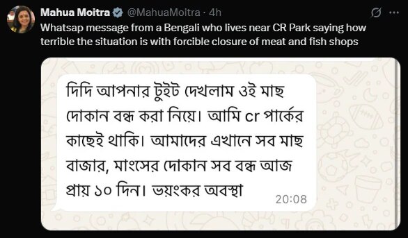 इसके अलावा अपने आरोप को पुष्ट करने के लिए मोइत्रा ने एक निवासी द्वारा बंगाली में लिखे गए व्हाट्सएप संदेश का स्क्रीनशॉट साझा किया, जिसमें दावा किया गया था कि सीआर पार्क में मांस और मछली की दुकानों को जबरन बंद करना एक भयानक स्थिति थी.