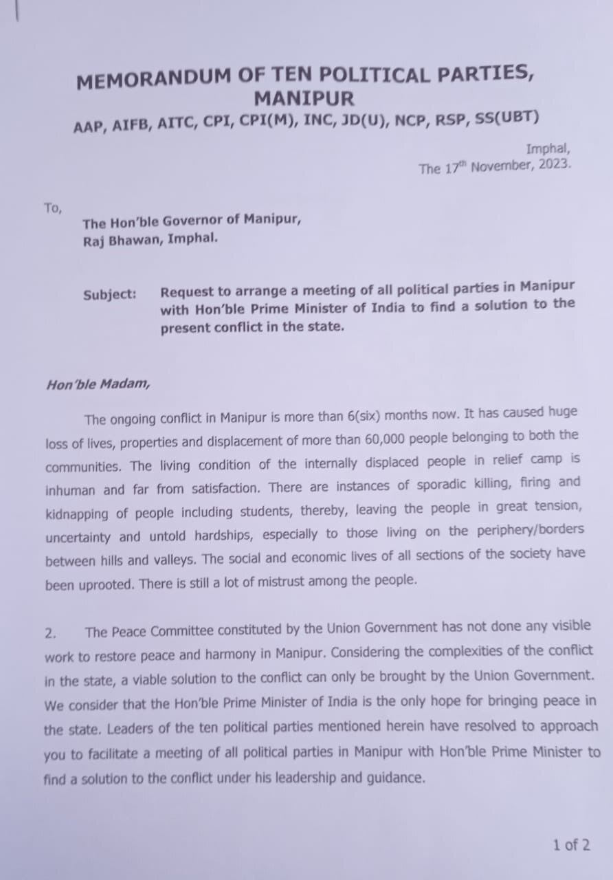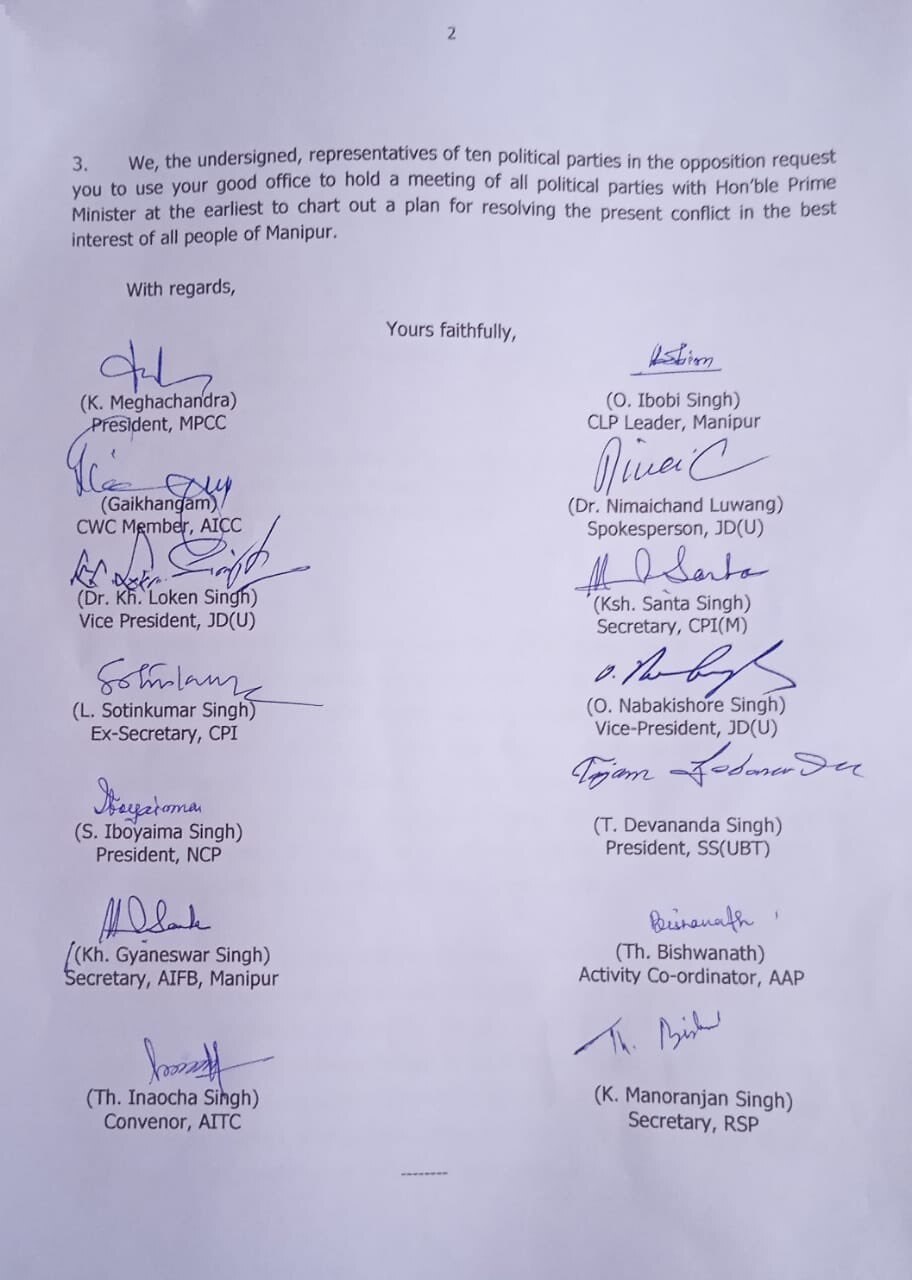 कांग्रेस विधायक दल के नेता एवं पूर्व मुख्यमंत्री ओ इबोबी सिंह की अगुवाई वाले एक दल ने राज्यपाल को एक ज्ञापन सौंपा था. ज्ञापन में कहा गया था कि प्रधानमंत्री मोदी के हस्तक्षेप के बिना राज्य में शांति बहाल नहीं की जा सकती. दो समुदायों के बीच शांति वार्ता के लिए तत्काल पहल की मांग की गई ताकि जारी संघर्ष का स्थाई समाधान निकाला जा सके.
