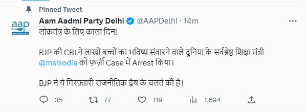 आम आदमी पार्टी ने ट्वीट किया, " लोकतंत्र के लिए काला दिन! BJP की CBI ने लाखों बच्चों का भविष्य संवारने वाले दुनिया के सर्वश्रेष्ठ शिक्षा मंत्री मनीष सिसोदिया को फ़र्ज़ी Case में Arrest किया. BJP ने ये गिरफ़्तारी राजनीतिक द्वैष के चलते की है."