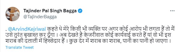 बीजेपी नेता तजिंदर पाल बग्गा ने ट्वीट करते हुए अरविंद केजरीवाल पर निशाना साधा. उन्होंने लिखा, "कहते थे मेरे किसी भी व्यक्ति पर अगर कोई आरोप भी लगता हैं तो मैं उसे तुरंत बर्खास्त कर दूंगा. अब देखते हैं केजरीवाल कोई कार्रवाई करते हैं यां वो भी इस शराब की दलाली में हिस्सेदार हैं. कुछ देर में शराब का शराब, पानी का पानी हो जाएगा."